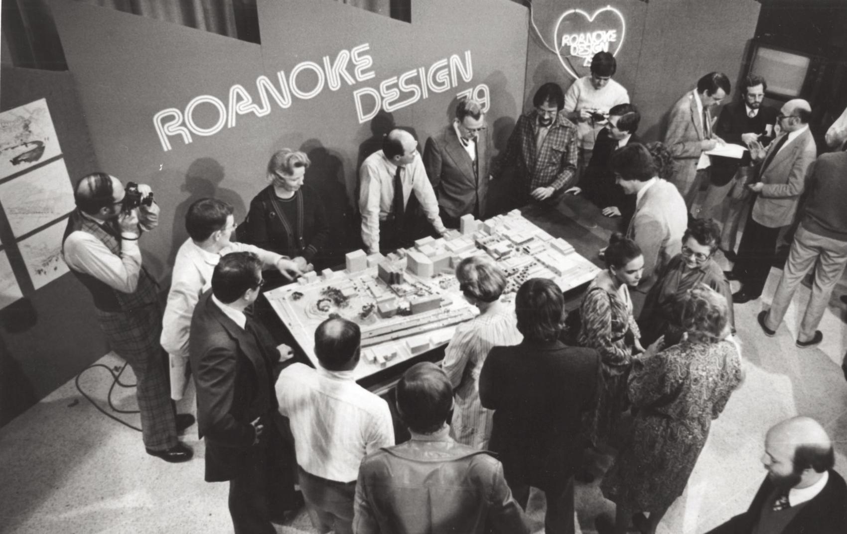 A bird’s-eye view of a scale model of downtown Roanoke, remodeled, which came about during the Design ’79 process as seen in Wayne Deel, “Editorial: 40 years since Roanoke’s revolutionary Design ’79,” The Roanoke Times, July 28, 2019.