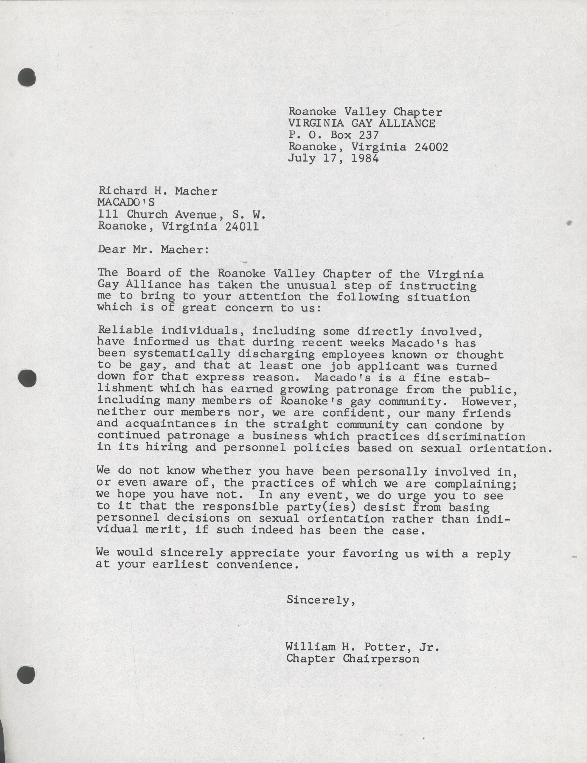Letter to Macado’s from the Roanoke Valley Chapter, Virginia Gay Alliance, July 17, 1984. Gerry Jennings Papers, LGBTQ History Collection, Virginia Room, Roanoke Public Library.