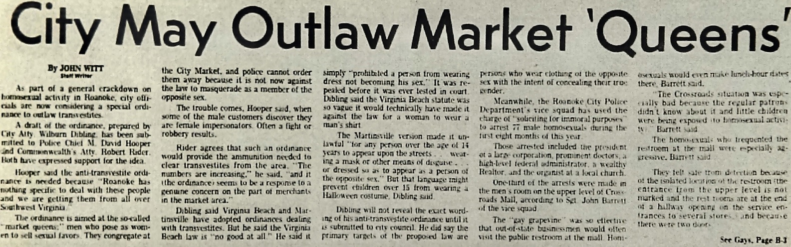 Below you will find archival and other supplementary materials related to the Downtown Roanoke LGBTQ History Walking Tour. Materials are organized according to the stops on the tour and are drawn from the laminated handouts and tour script. We encourage educators and tour participants to continue their experience by exploring through the materials below.