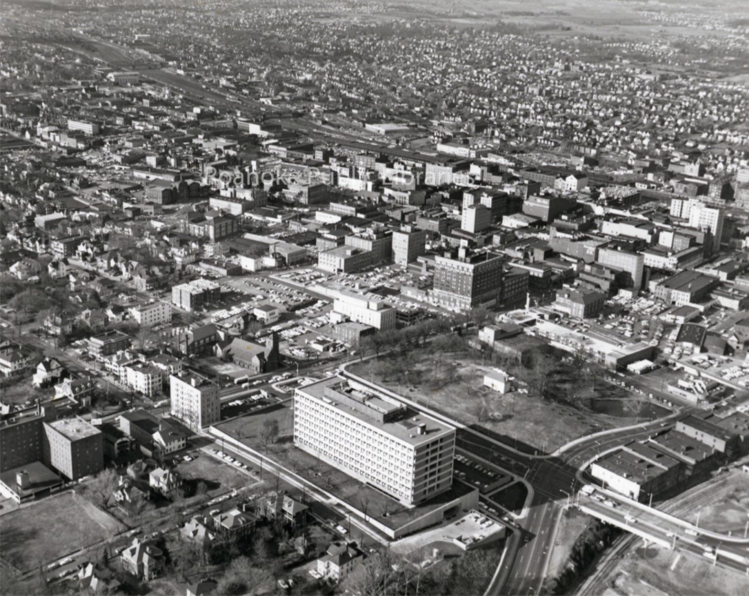 Aerial Photograph of Downtown Roanoke, including Elmwood Park, 1968. Virginia Room, Roanoke Public Libraries. George C. Davis Photographic Records.