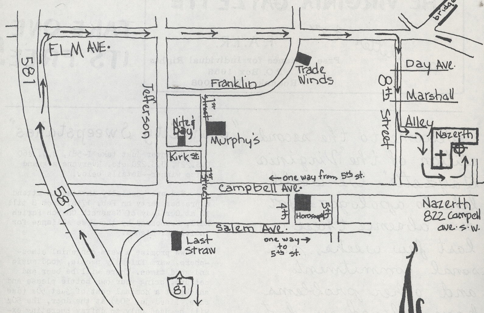 Downtown Roanoke bar map from the February 1978 edition of The Virginia Gayzette.