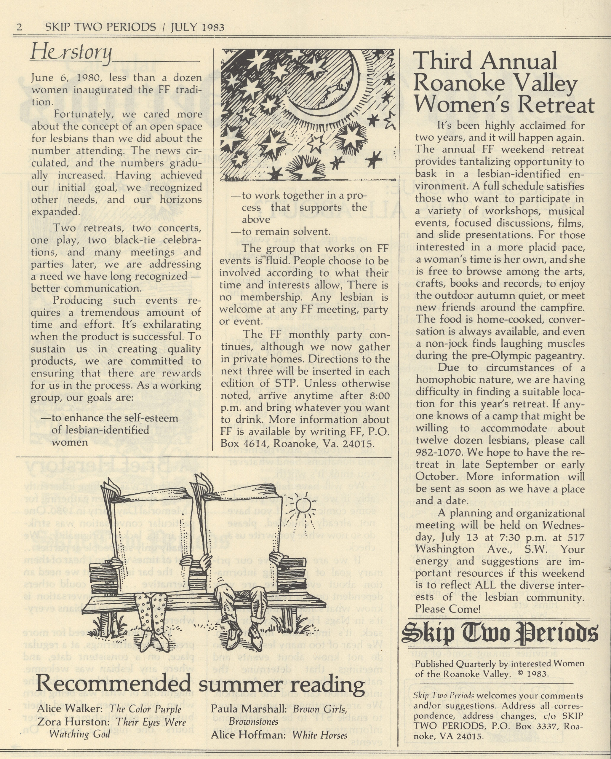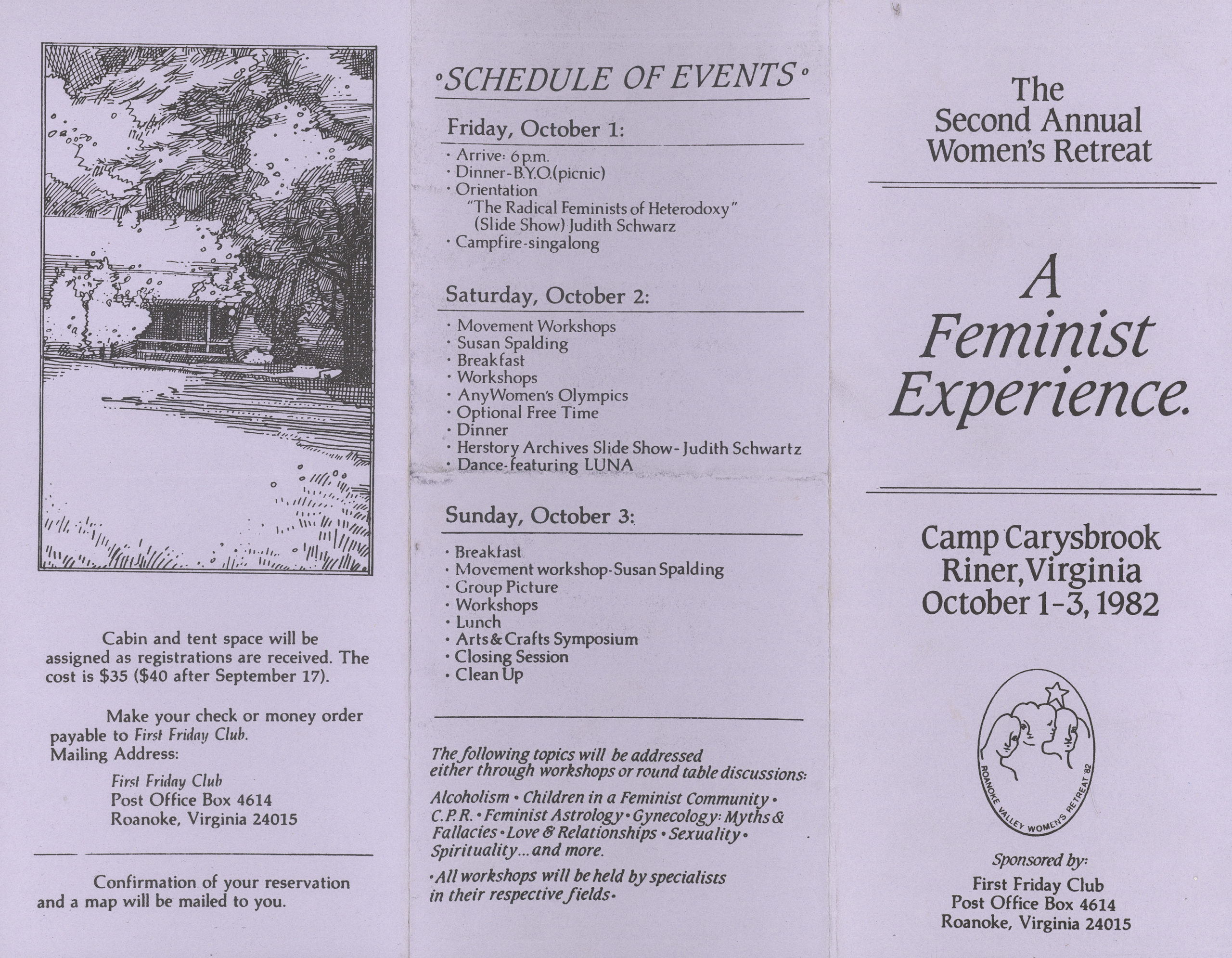 Roanoke Valley Women’s Retreat brochure, 1982. Edward F. “Gerry” Jennings, Jr. Papers, LGBTQ History Collection, Virginia Room, Roanoke Public Library.