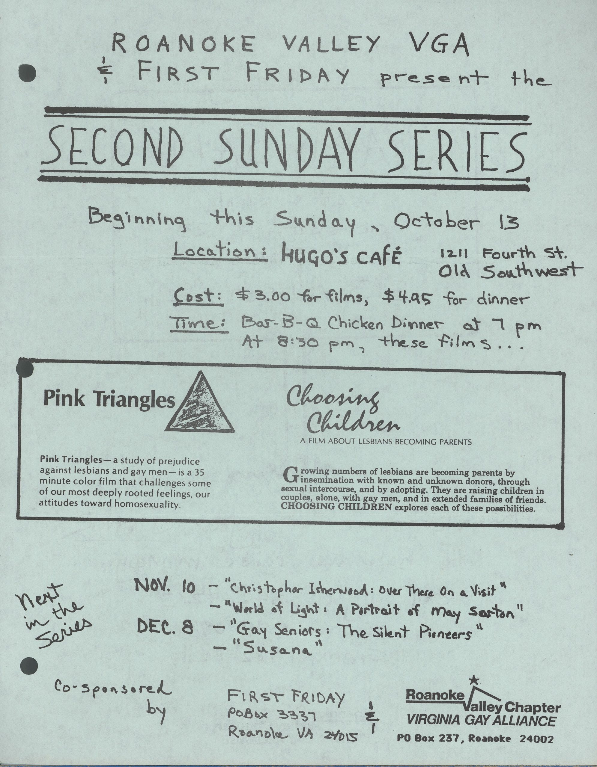 “Second Sunday Series” flyer, October 1985, Edward F. “Gerry” Jennings, Jr. Papers, LGBTQ History Collection, Virginia Room, Roanoke Public Library.