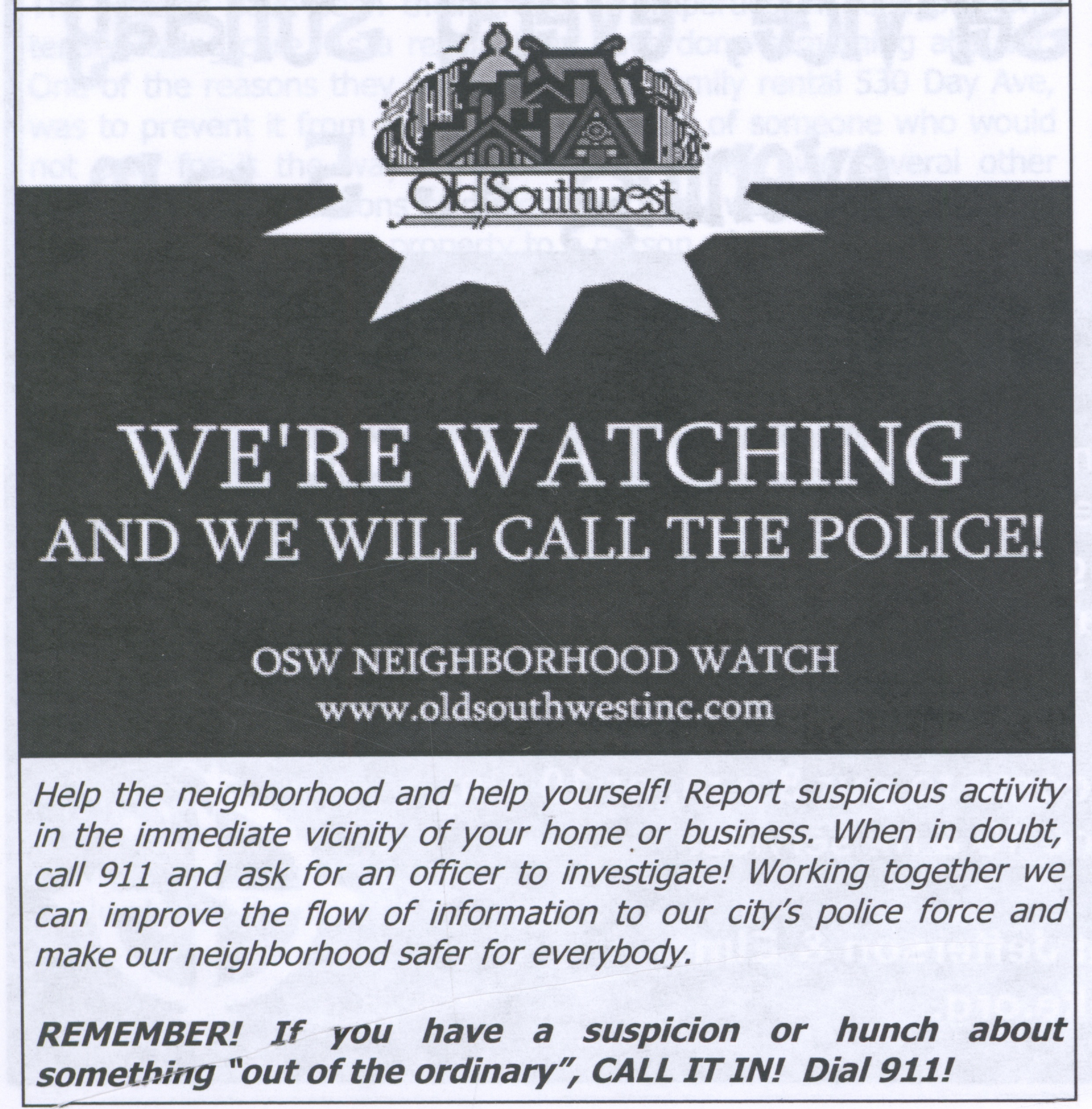 OSW Neighborhood Watch advertisement. Old Southwest News, June/July 2008. Virginia Room, Roanoke Public Libraries.