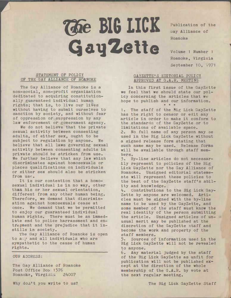 For information about GARV, Roanoke’s first gay rights group, see the September 1971 edition of the Big Lick Gayzette.