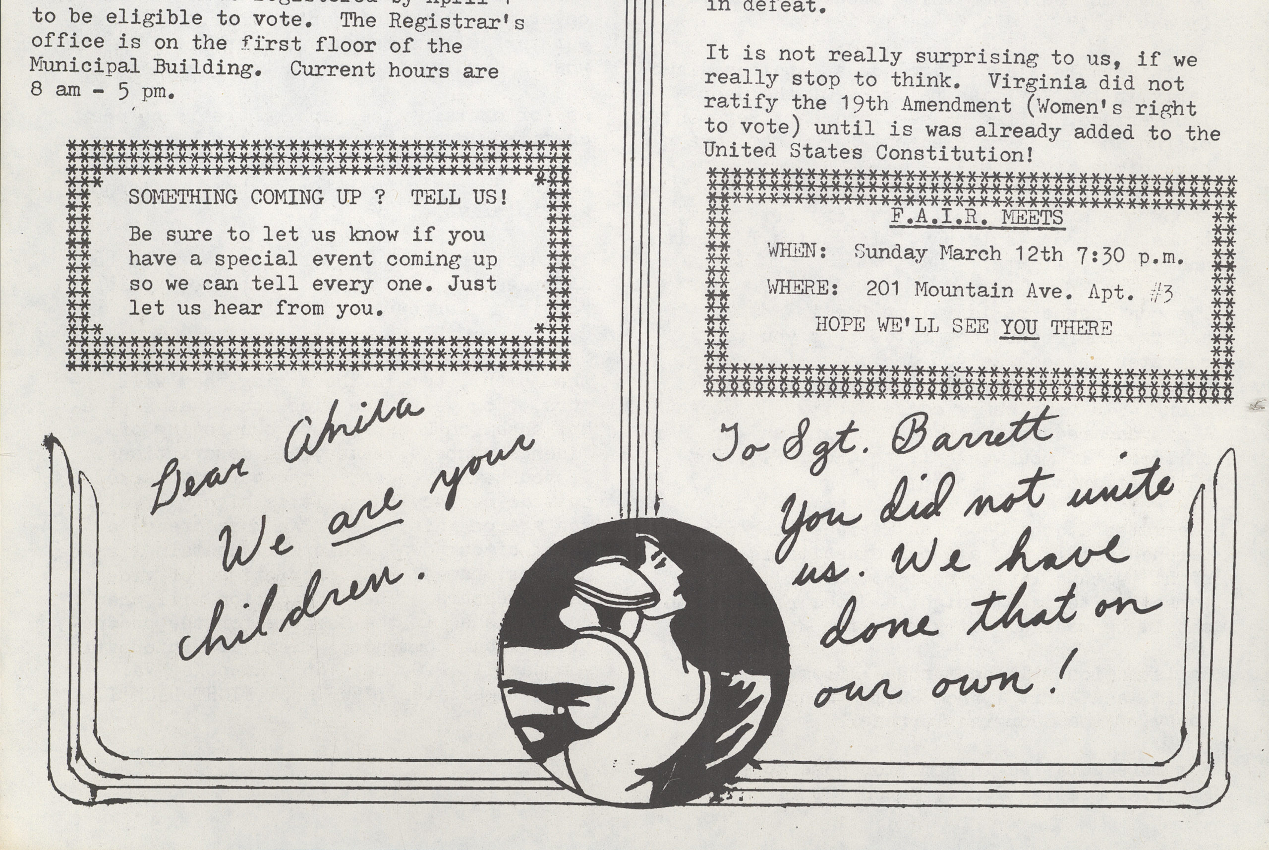 FAIR meeting advertisement from the March 1978 edition of The Virginia Gayzette. This meeting was held at 201 Mountain Avenue SW, Apt. 3.