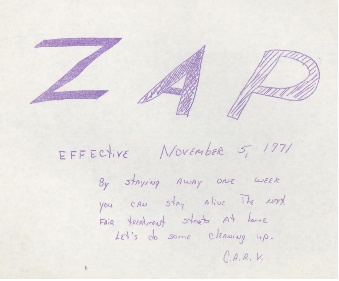 Insert informing the community of GARV’s “zap” on the Trade Winds from the November 5, 1971 edition of The Big Lick Gayzette.