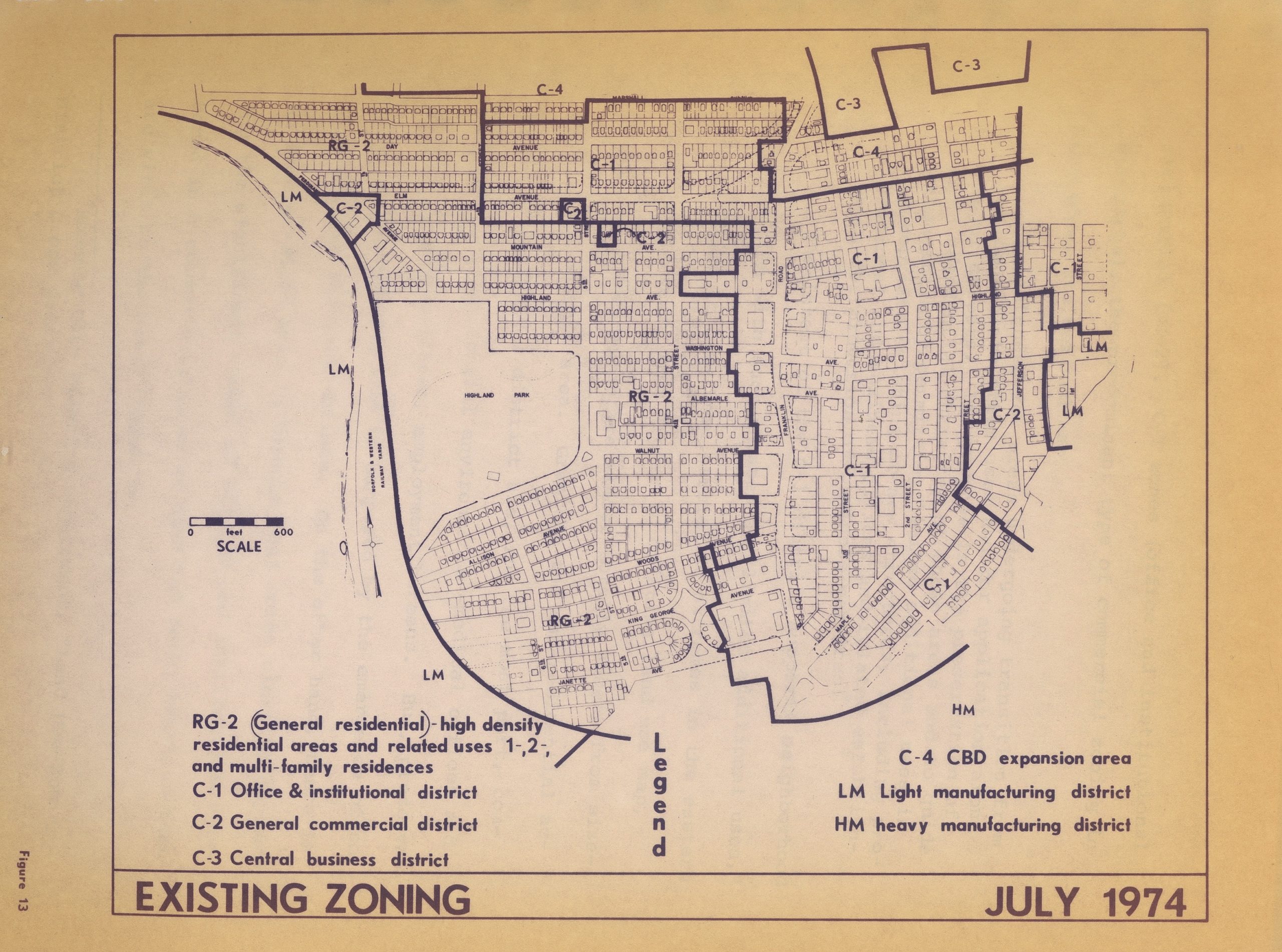 “Existing Zoning” Map, 1974, excerpted from Highland Park: A Neighborhood Study (1975). Courtesy of the Virginia Room, Roanoke Public Library.