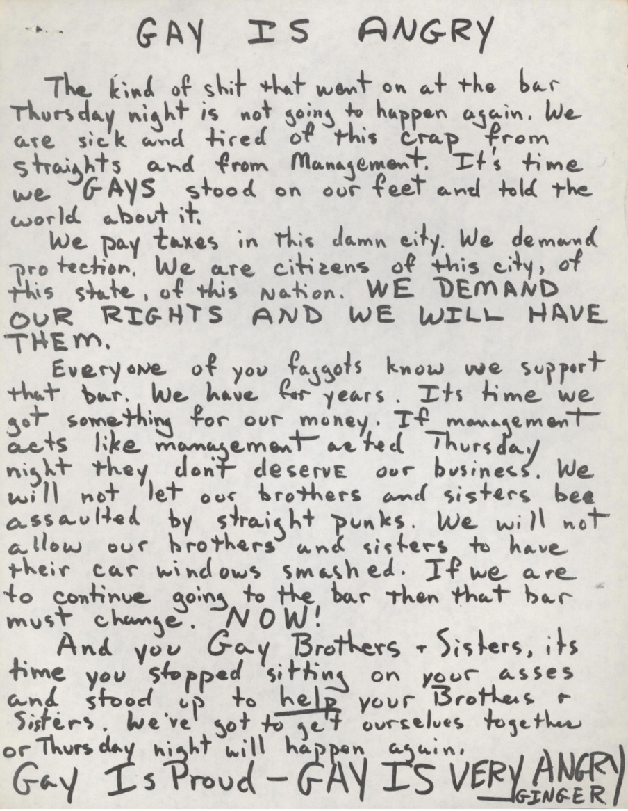 Insert detailing a response to the incident at the Trade Winds on November 4, 1971, from the November 5, 1971 edition of The Big Lick Gayzette.