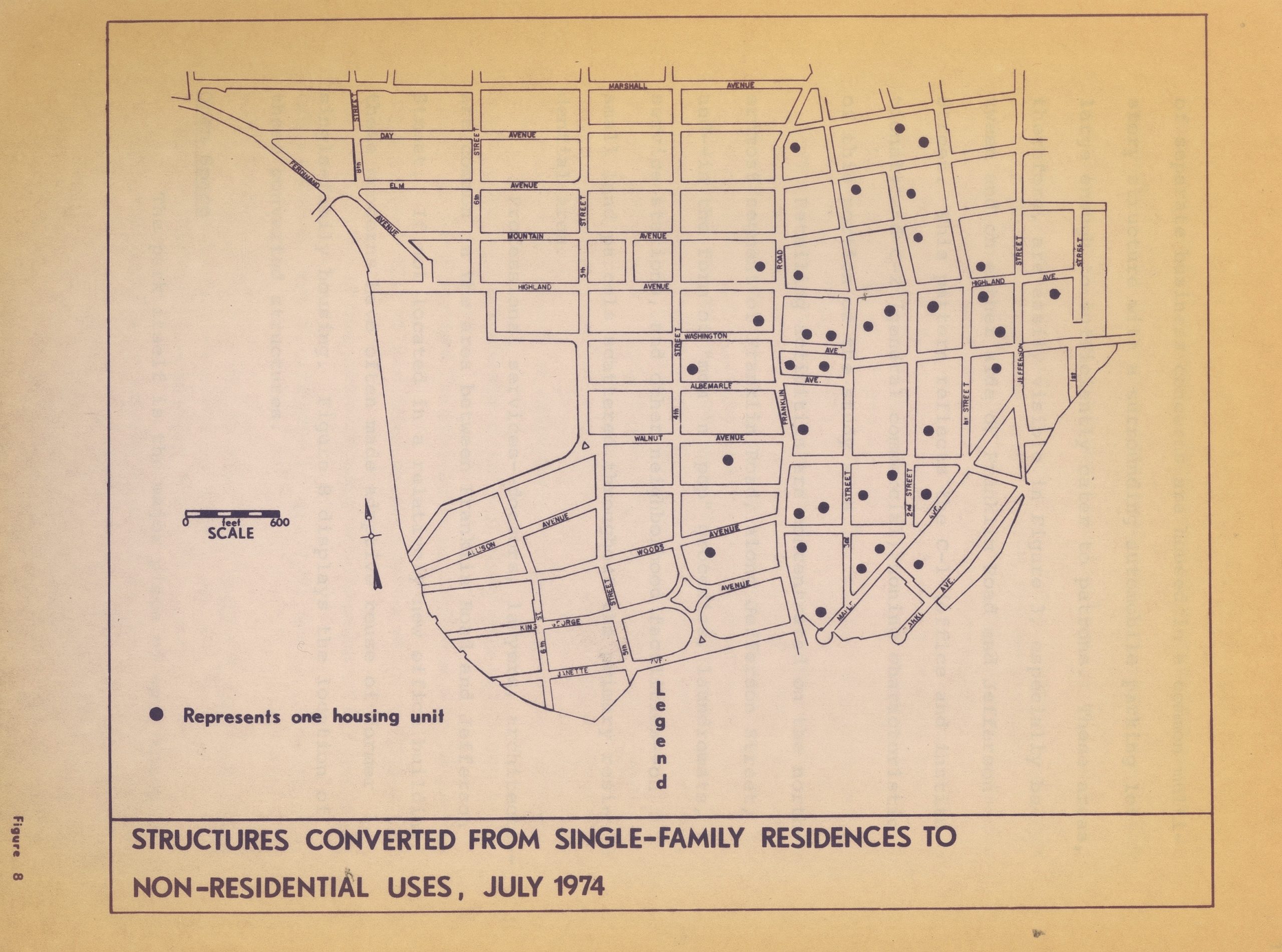 “Structures converted from single-family residences to non-residential uses,” 1974, excerpted from Highland Park: A Neighborhood Study (1975). Courtesy of the Virginia Room, Roanoke Public Library.