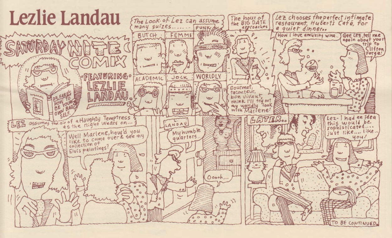 “Lezlie Landau” lesbian comic strip from the June 1985 edition of Skip Two Periods. “Hubert’s Cafe” in the comic strip is a fictionalized version of Hugo’s.