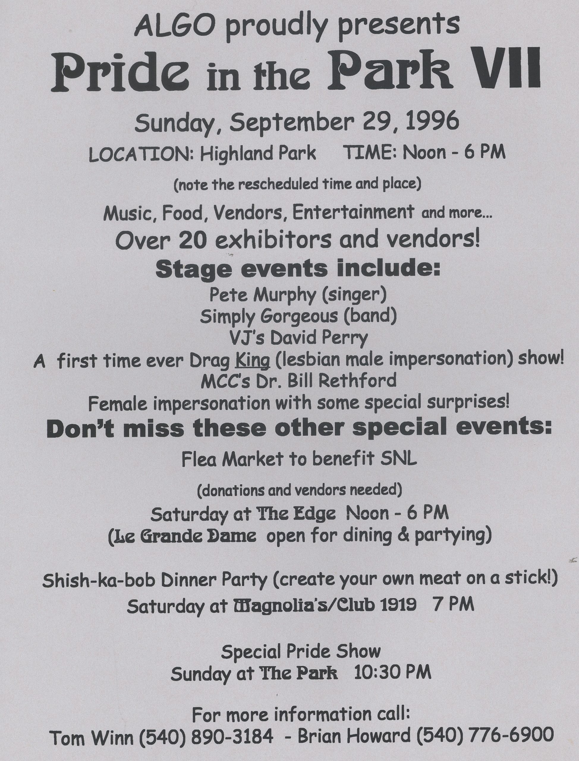 Pride in the Park VII flyer, September 29, 1996, Edward F. “Gerry” Jennings Jr. Papers, LGBTQ History Collection, Virginia Room, Roanoke Public Library.