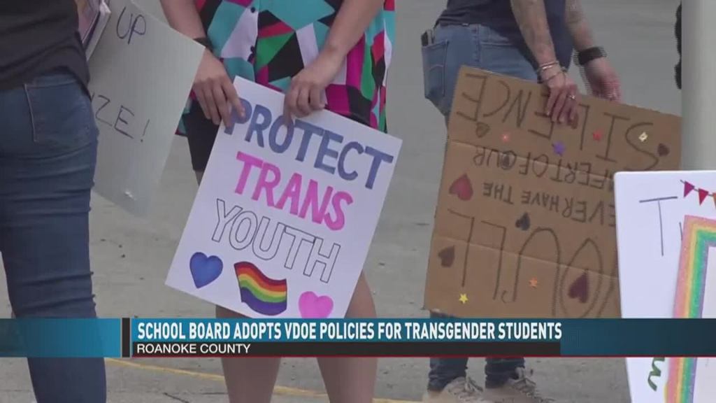 Image still from Patsy Montesinos, “Roanoke Co. School Board adopts model policies for transgender students; one person arrested during meeting,” WDBJ-7, August 17, 2023.